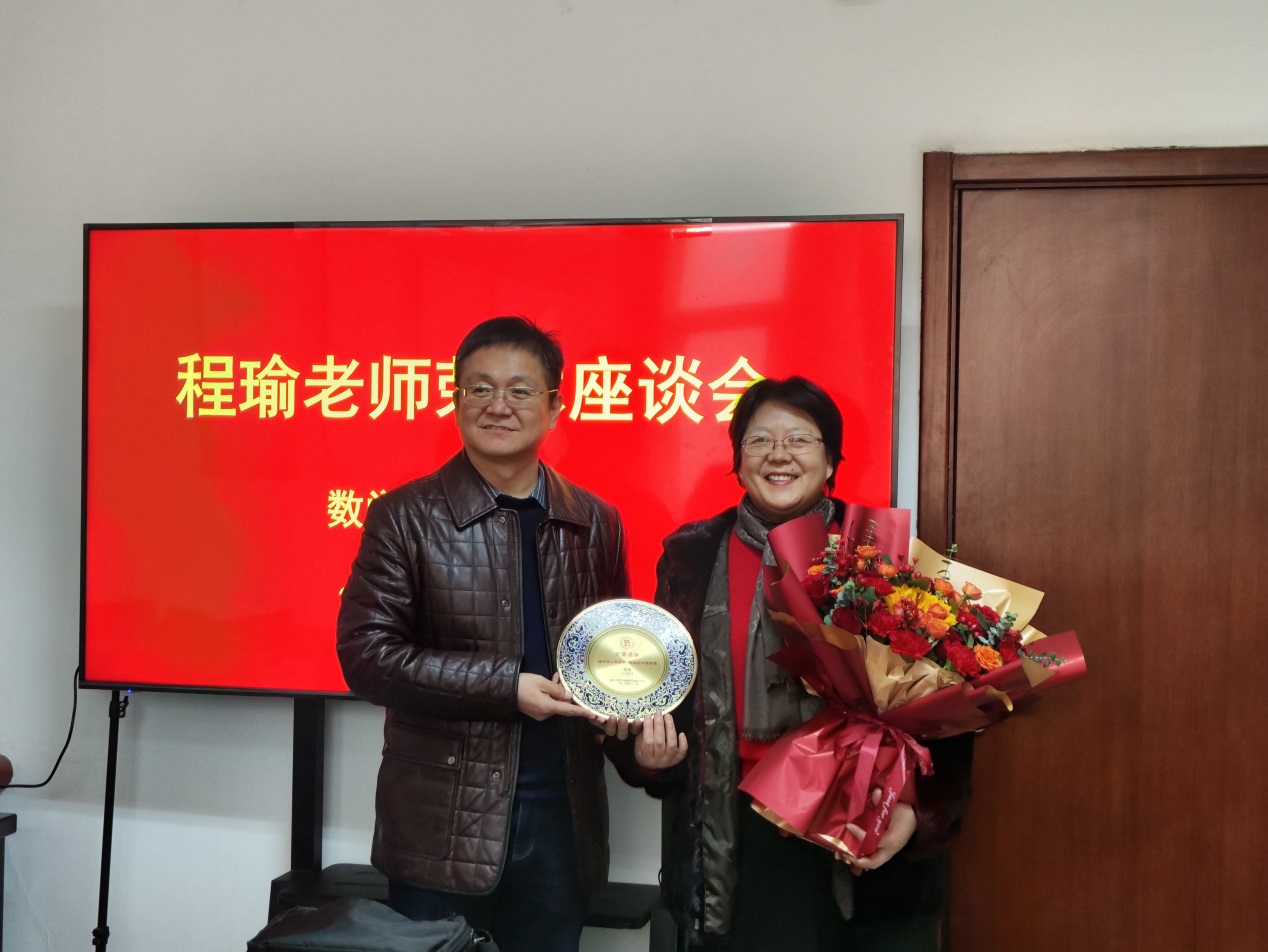 会后,赵志超书记和苏有慧经理代表学院给程瑜老师送上鲜花和纪念品,大家和程瑜老师合影留念。